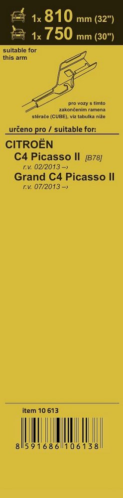 Sada dvou plochých stěračů FLAT (řidič + spolujezdec) se speciálním uchycením. Délky stěračů a systém uchycení na ramínko jsou přizpůsobeny vybraným vozům (viz tabulka použití).Vysoce kvalitní pružný člen plochého stěrače zajišťuje stejnoměrný tlak grafitového břitu v celé jeho délce, což zamezuje rozmazávání nečistot a vytváření pruhů.určeno pro vozy:značkarok výrobyCitroën C4 Picasso II [B78]... Celý popis
