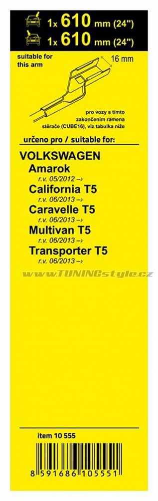 Sada dvou plochých stěračů FLAT (řidič + spolujezdec) se speciálním uchycením. Délky stěračů a systém uchycení na ramínko jsou přizpůsobeny vybraným vozům (viz tabulka použití).Vysoce kvalitní pružný člen plochého stěrače zajišťuje stejnoměrný tlak grafitového břitu v celé jeho délce, což zamezuje rozmazávání nečistot a vytváření pruhů.určeno pro vozy:značkarok výrobyVW Amarok [2H]05/12 - 10/16... Celý popis