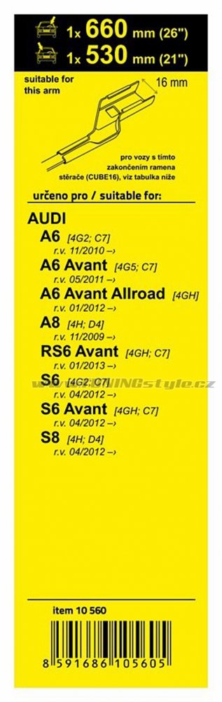 Sada dvou plochých stěračů FLAT (řidič + spolujezdec) se speciálním uchycením. Délky stěračů a systém uchycení na ramínko jsou přizpůsobeny vybraným vozům (viz tabulka použití).Vysoce kvalitní pružný člen plochého stěrače zajišťuje stejnoměrný tlak grafitového břitu v celé jeho délce, což zamezuje rozmazávání nečistot a vytváření pruhů.určeno pro vozy:značkarok výrobyAudi A6 [4G2;C7]11/10 - Aud... Celý popis