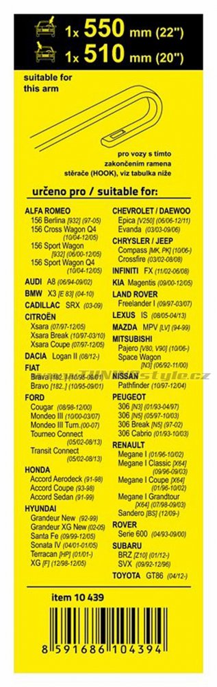 Sada dvou plochých stěračů FLAT (řidič + spolujezdec) se speciálním uchycením. Délky stěračů a systém uchycení na ramínko jsou přizpůsobeny vybraným vozům (viz tabulka použití).