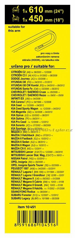Sada dvou plochých stěračů FLAT (řidič + spolujezdec) se speciálním uchycením. Délky stěračů a systém uchycení na ramínko jsou přizpůsobeny vybraným vozům (viz tabulka použití).