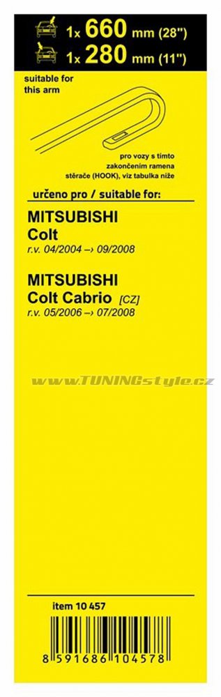 Sada dvou plochých stěračů FLAT (řidič + spolujezdec) se speciálním uchycením. Délky stěračů a systém uchycení na ramínko jsou přizpůsobeny vybraným vozům (viz tabulka použití).Vysoce kvalitní pružný člen plochého stěrače zajišťuje stejnoměrný tlak grafitového břitu v celé jeho délce, což zamezuje rozmazávání nečistot a vytváření pruhů.určeno pro vozy:značkarok výrobyMitsubishi Colt [CZ]04/04 -... Celý popis
