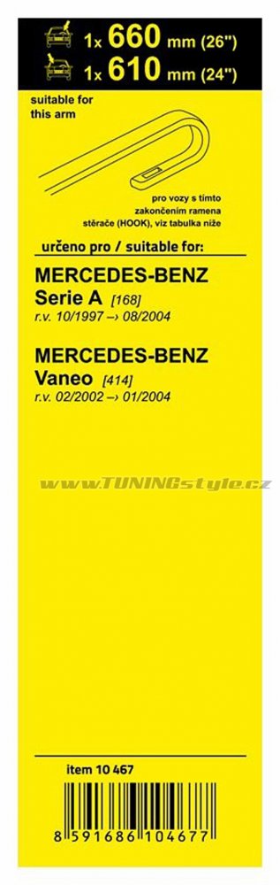 Sada dvou plochých stěračů FLAT (řidič + spolujezdec) se speciálním uchycením. Délky stěračů a systém uchycení na ramínko jsou přizpůsobeny vybraným vozům (viz tabulka použití).Vysoce kvalitní pružný člen plochého stěrače zajišťuje stejnoměrný tlak grafitového břitu v celé jeho délce, což zamezuje rozmazávání nečistot a vytváření pruhů.určeno pro vozy:značkarok výrobyMercedes-Benz Serie A [168]... Celý popis