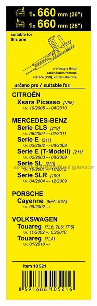 Sada dvou plochých stěračů FLAT (řidič + spolujezdec) se speciálním uchycením. Délky stěračů a systém uchycení na ramínko jsou přizpůsobeny vybraným vozům (viz tabulka použití).Vysoce kvalitní pružný člen plochého stěrače zajišťuje stejnoměrný tlak grafitového břitu v celé jeho délce, což zamezuje rozmazávání nečistot a vytváření pruhů.určeno pro vozy:značkarok výrobyCitroën Xsara Picasso [N68]... Celý popis
