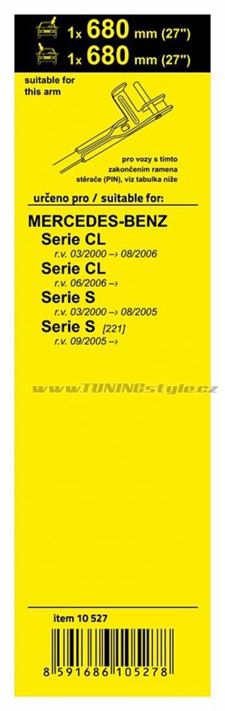 Sada dvou plochých stěračů FLAT (řidič + spolujezdec) se speciálním uchycením. Délky stěračů a systém uchycení na ramínko jsou přizpůsobeny vybraným vozům (viz tabulka použití).Vysoce kvalitní pružný člen plochého stěrače zajišťuje stejnoměrný tlak grafitového břitu v celé jeho délce, což zamezuje rozmazávání nečistot a vytváření pruhů.určeno pro vozy:značkarok výrobyMercedes-Benz Serie CL (Cou... Celý popis