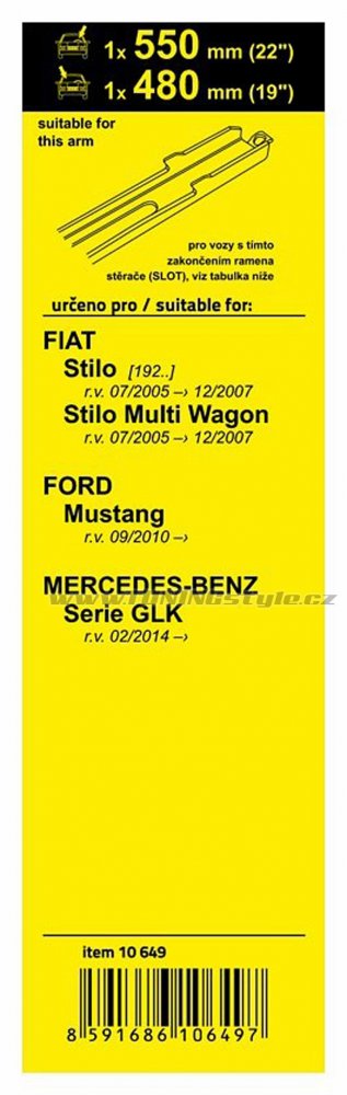 Sada dvou plochých stěračů FLAT (řidič + spolujezdec) se speciálním uchycením. Délky stěračů a systém uchycení na ramínko jsou přizpůsobeny vybraným vozům (viz tabulka použití).Vysoce kvalitní pružný člen plochého stěrače zajišťuje stejnoměrný tlak grafitového břitu v celé jeho délce, což zamezuje rozmazávání nečistot a vytváření pruhů.určeno pro vozy:značkarok výrobyFiat Stilo [192..]07/05 - 1... Celý popis