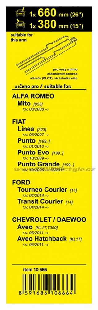Sada dvou plochých stěračů FLAT (řidič + spolujezdec) se speciálním uchycením. Délky stěračů a systém uchycení na ramínko jsou přizpůsobeny vybraným vozům (viz tabulka použití).Vysoce kvalitní pružný člen plochého stěrače zajišťuje stejnoměrný tlak grafitového břitu v celé jeho délce, což zamezuje rozmazávání nečistot a vytváření pruhů.určeno pro vozy:značkarok výrobyAlfa Romeo Mito [955]08/08 ... Celý popis