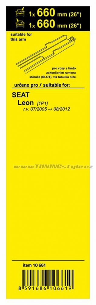 Sada dvou plochých stěračů FLAT (řidič + spolujezdec) se speciálním uchycením. Délky stěračů a systém uchycení na ramínko jsou přizpůsobeny vybraným vozům (viz tabulka použití).