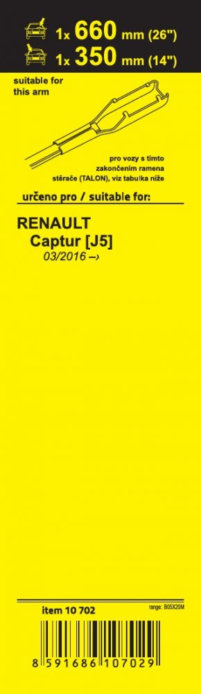 Sada dvou plochých stěračů FLAT (řidič + spolujezdec) se speciálním uchycením. Délky stěračů a systém uchycení na ramínko jsou přizpůsobeny vybraným vozům (viz tabulka použití).Vysoce kvalitní pružný člen plochého stěrače zajišťuje stejnoměrný tlak grafitového břitu v celé jeho délce, což zamezuje rozmazávání nečistot a vytváření pruhů.určeno pro vozy:značkarok výrobyRenault Captur [J5]03/16 - ... Celý popis