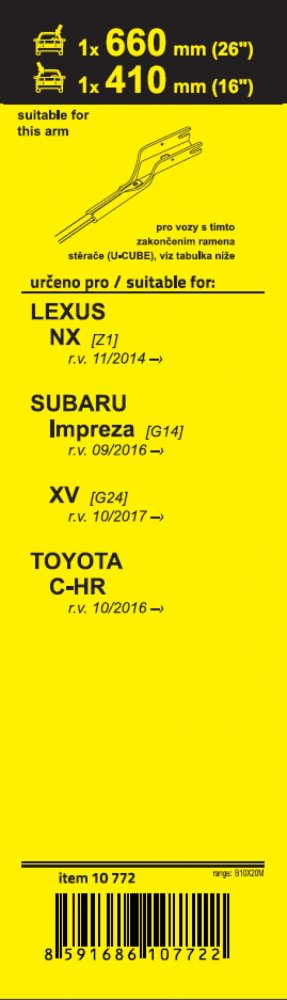 Sada dvou plochých stěračů FLAT (řidič + spolujezdec) se speciálním uchycením. Délky stěračů a systém uchycení na ramínko jsou přizpůsobeny vybraným vozům (viz tabulka použití).Vysoce kvalitní pružný člen plochého stěrače zajišťuje stejnoměrný tlak grafitového břitu v celé jeho délce, což zamezuje rozmazávání nečistot a vytváření pruhů.určeno pro vozy:značkarok výrobyLexus NX [Z1]11/14 - Subaru... Celý popis