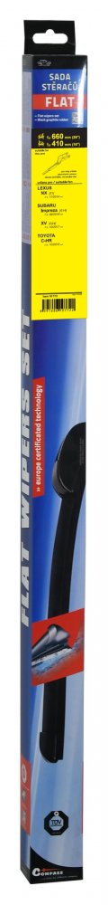 Sada dvou plochých stěračů FLAT (řidič + spolujezdec) se speciálním uchycením. Délky stěračů a systém uchycení na ramínko jsou přizpůsobeny vybraným vozům (viz tabulka použití).