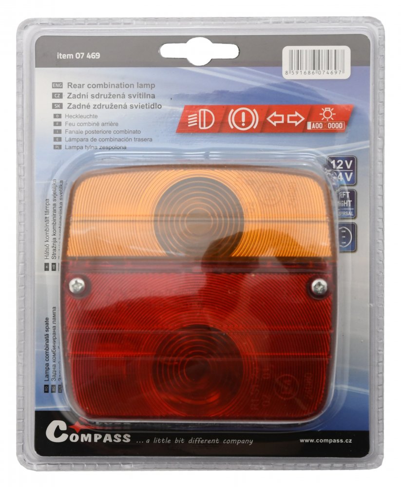 Sdružená koncová svítilna s napájením 12V nebo 24V. Svítilna je opatřena obrysovým, brzdovým, směrovým světlem a osvětlením SPZ. Univerzální použití zajišťuje možnost připevnit pomocí přiložených šroubků na libovolné místo na levou i pravou stranu. Balení obsahuje standartní 12V žárovky. Pro výměnu žárovek je třeba odšroubovat celý přední kryt svítilny. Pro použití u 24V systému je třeba nahrad... Celý popis