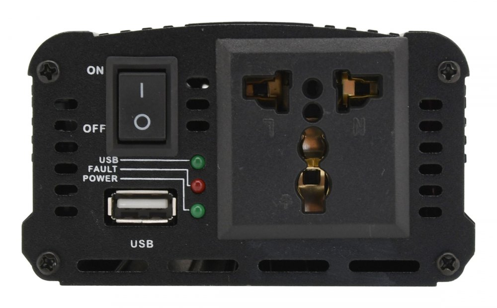 Výstup měniče je osazen běžnou zásuvkou 230V evropského typu pro spotřebiče bez zemnícího kolíku tj "dvoukolíková" zástrčka. Navíc je k dispozici USB zásuvka, vhodná pro MP3 přehrávače, mobilní telefony a další zařízení, která se nabíjejí, či napájejí běžným USB zdrojem 5V až do příkonu 1000mA.