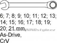 Sada 16 kusů očkových klíčů z CrV oceli. Funkce AS-DRIVE umožňuje vyvinout větší kontaktní sílu, neboť ke kontaktu se šroubem nedochází na hranách šestihranu, nýbrž v první třetině styčných ploch.Tím nedochází k poničení hlavice šroubu a ořech mnohdy povolí i matice a šrouby již poničené.Obsah balení: Rozměry: 6, 7, 8, 9, 10, 11, 12, 13, 14, 15, 16, 17, 18, 19, 20, 21 mm Celý popis