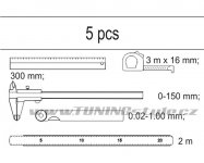 Sada 5 kusů měřidel. Sada je přehledně srovnána ve vložce do zásuvky z PVC.Obsah balení: Svinovací metr: 3 m x 16 mm Ocelové pravitko: 300 mm Posuvné měřítko: 0 - 150 mm Skládací metr: 2 m Spárová měrka: 0,02 - 1,00 mm Celý popis