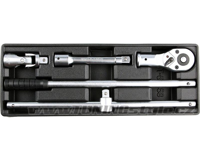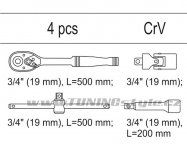 Sada 4 kusů ráčen a nástavců z CrV oceli. Sada je přehledně srovnána ve vložce do zásuvky z PVC.Obsah balení: Prodlužovací nástavec 3/4": 200 mm Ráčna 3/4": 500 mm T-vratidlo 3/4": 500 mm Kloubový nástavec: 3/4" Celý popis