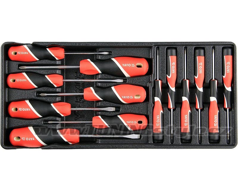 Sada 13 kusů šroubováků z oceli. Sada je přehledně srovnána ve vložce do zásuvky z PVC.Obsah balení: Křížový: PH00x50; PH0x50; PH0x75; PH1x50; PH1x75; PH2x100 mm Plochý: 1,4x50; 2,0x50; 2,4x50; 3x75; 4x100; 5x75; 6x100 mm Celý popis