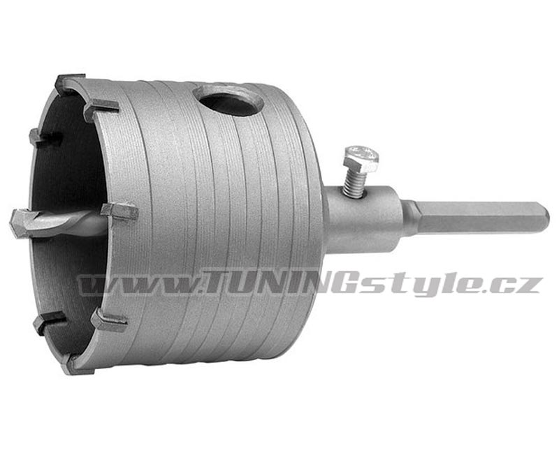 Korunkový vrták s tvrdokovovými zuby pro příklepové vrtání betonu a zdiva vrtačkou s elektropneumatickým příklepem, s klasickým upínáním.