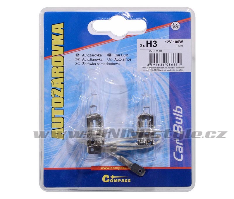 Halogenová autožárovka 12V, sklo žárovky s UV filtrem.Balení blister á 2 ks.Tento výrobek není schválen pro provoz na pozemních komunikacích ČR. Určeno pro sportovní a jiné účely.technická data: typ žárovkyH3napětí12 Vpříkon100WpaticePk22sUV filtranosada2 ks Celý popis