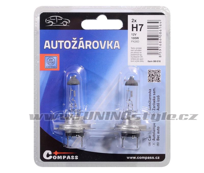 Halogenová autožárovka 12V, sklo žárovky s UV filtrem.Balení blister á 2 ks.Tento výrobek není schválen pro provoz na pozemních komunikacích ČR. Určeno pro sportovní a jiné účely.technická data: typ žárovkyH7napětí12 Vpříkon100WpaticePX26dUV filtranosada2 ks Celý popis
