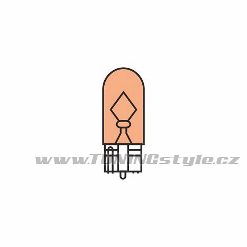 Autožárovka 12V, homologace E, sklo žárovky s UV filtrem - žárovka je vhodná pro všechny druhy světlometů.Barva světla - oranžová. Žárovka je určena především pro směrová světla s čirým krytem.Upozornění: Baleno v papírové krabičce á 10ks, prodej možný pouze po 10ti kusech.technická data: typ žárovkyWY5W (T10)napětí12 Vpříkon5WpaticeW2,1x9,5dUV filtranohomologaceEbarva světlaoranžová Celý popis