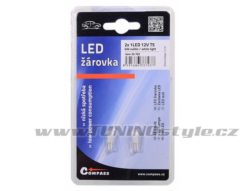 LED dioda s paticí klasické automobilové žárovky - nízká spotřeba proudu, dlouhá životnost. Lze použít jako náhradu klasické autožárovky. technická data: počet LED 1x patice T5 (W2x4,6d) napájení 12 V příkon 0,2 W Světelný tok 7 lm barva světla bílá balení 2 ks Tento výrobek není schválen pro provoz na pozemních komunikacích ČR. Určeno pro sportovní a jiné účely. Celý popis