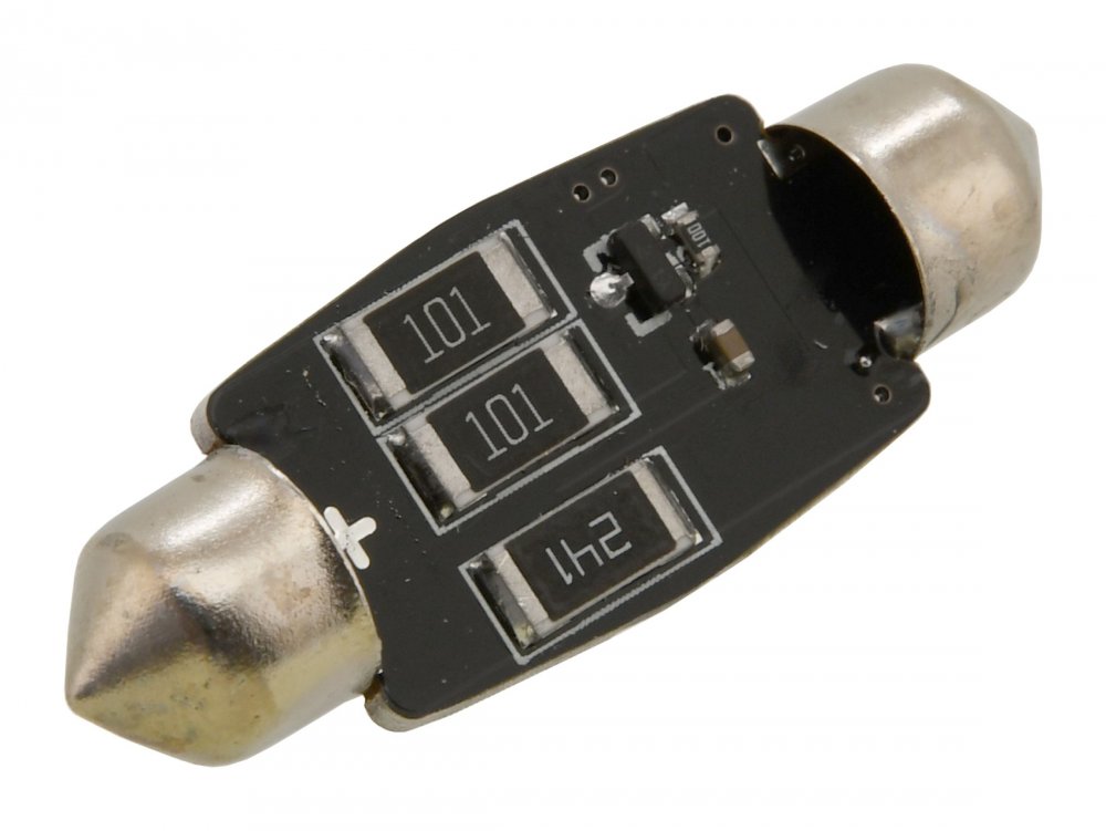 Vysocesvítivé čipové SMD LED diody s paticí klasické automobilové žárovky - nízká spotřeba proudu. Tato LED žárovka je vybavena funkcí CAN-BUS ready (zabudovaný rezistor), zabraňuje signalizaci prasklé žárovky u novějších automobilů s kontrolou stavu žárovek řídící jednotkou vozu. technická data: počet LED 3x patice SV8.5 (sufit) délka 38 mm napájení 12 V příkon 3 W světelný tok 60 lm... Celý popis