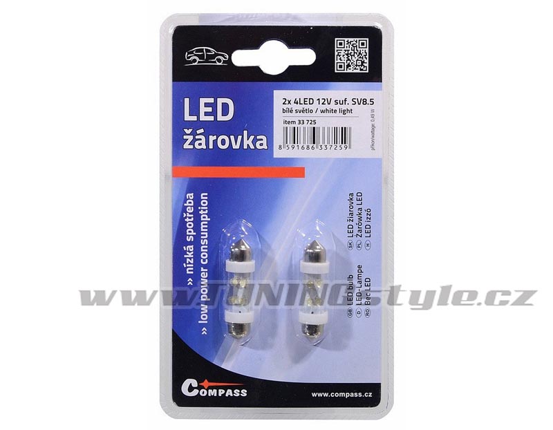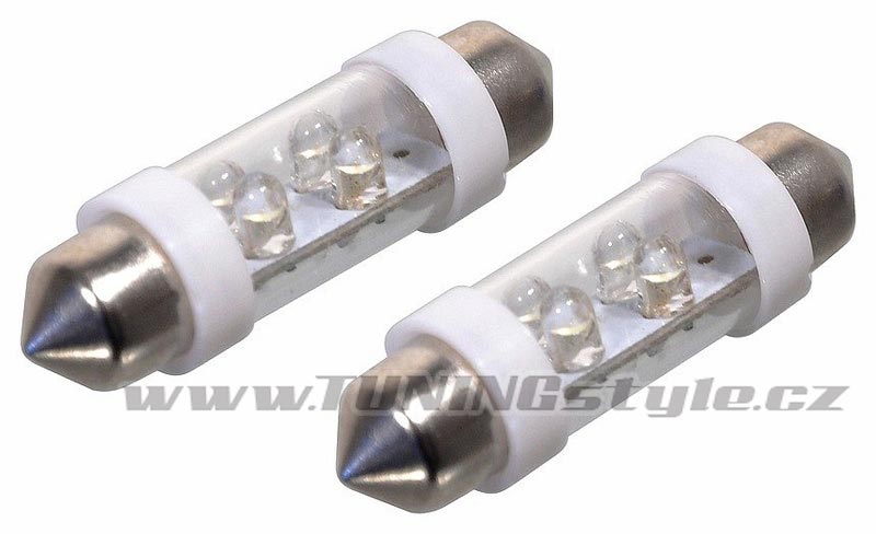 LED diody s paticí klasické automobilové žárovky - nízká spotřeba proudu, dlouhá životnost. Lze použít jako náhradu klasické autožárovky. technická data: počet LED 4x patice SV8.5 (sufit) délka 38 mm napájení 12 V příkon 0,49 W Světelný tok 28 lm barva světla bílá balení 2 ks Tento výrobek není schválen pro provoz na pozemních komunikacích ČR. Určeno pro sportovní a jiné účely. Celý popis