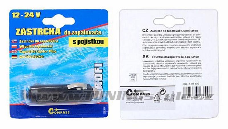 Univerzální zástrčka pro připojení spotřebičů do standardní zásuvky zapalovače automobilu. Zařízení je určeno pro napětí 12 nebo 24V. Zástrčka je vybavena skleněnou pojistkou 10A. Její výměnu lze provést odšroubováním přední části zástrčky. Technická data napájení 12 / 24 V max. příkon 10 A pojistka skleněná, vyměnitelná Celý popis